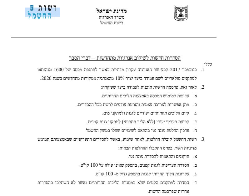 הסדרה תעריפית לגגות קטנים – בהספק של עד 100 קו"ט.