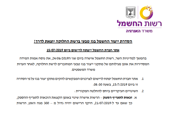 19.7.19 – עדכון בנוגע להסדרת ייצור החשמל בגז טבעי/