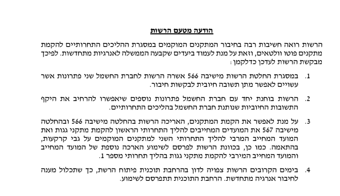 11.11.19 – הודעת הרשות בדבר חיבור המתקנים המוקמים במסגרת זכייה בהליכים התחרותיים להקמת מתקנים פוטו וולטאים/