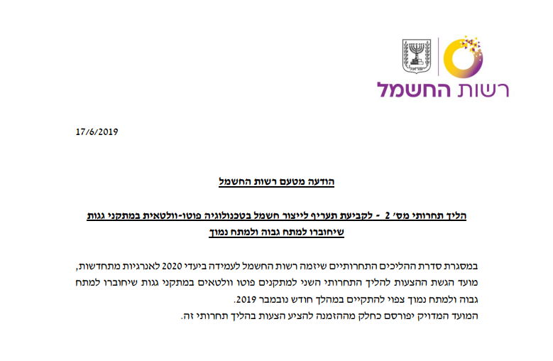 19.9.19 – הליך תחרותי מס' 2 – לקביעת תעריף לייצור חשמל בטכנולוגיה פוטו-וולטאית במתקני גגות שיחוברו למתח גבוה ולמתח נמוך/
