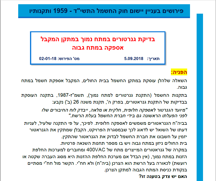 מעת לעת, מינהל החשמל מפרסם מאגר פירושים ותשובות בעניין חוק החשמל ותקנותיו.
