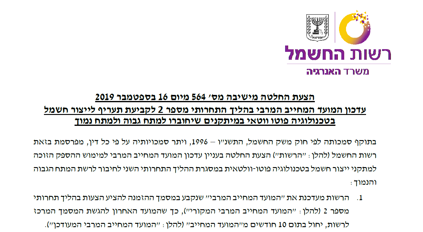 שימוע – עדכון המועד המחייב המרבי בהליך התחרותי מספר 2 לקביעת תעריף לייצור חשמל בטכנולוגיה פוטו ווטאי במיתקנים שיחוברו למתח גבוה ולמתח נמוך.