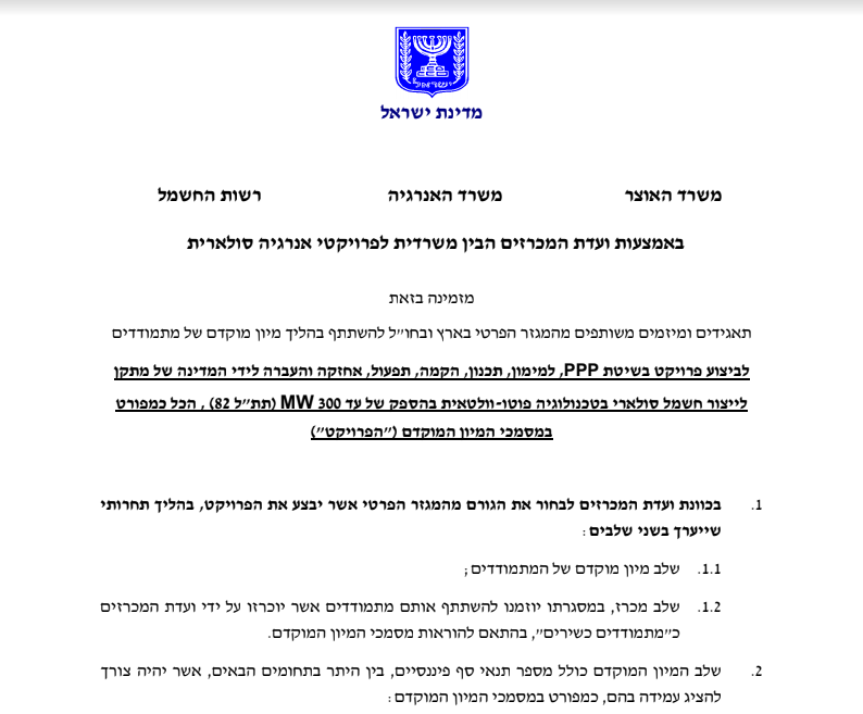 ועדת המכרזים הבין משרדית לפרוייקטי אנרגיה סולארית המשותפת למשרדי האוצר, האנרגיה, רשות החשמל והחברה הממשלתית ענבל, פרסמה את מסמכי המיון המוקדם במכרז פומבי להקמה ותפעול של תחנת כוח סולארית בסמוך לדימונה. לחצ/י כאן להמשך קריאה>>