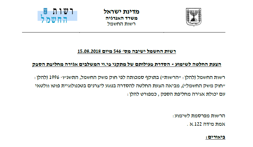 החלטה לשימוע – תעריף עסקה קרובה ליצרן במתח עליון לאחר הערות 2018-08-08 >>