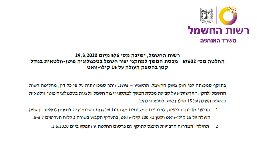30.3.20 – מכסת המשך למתקני יצור חשמל בטכנולוגיה פוטו-וולטאית בגודל קטן בהספק העולה על 15 קילו-וואט/