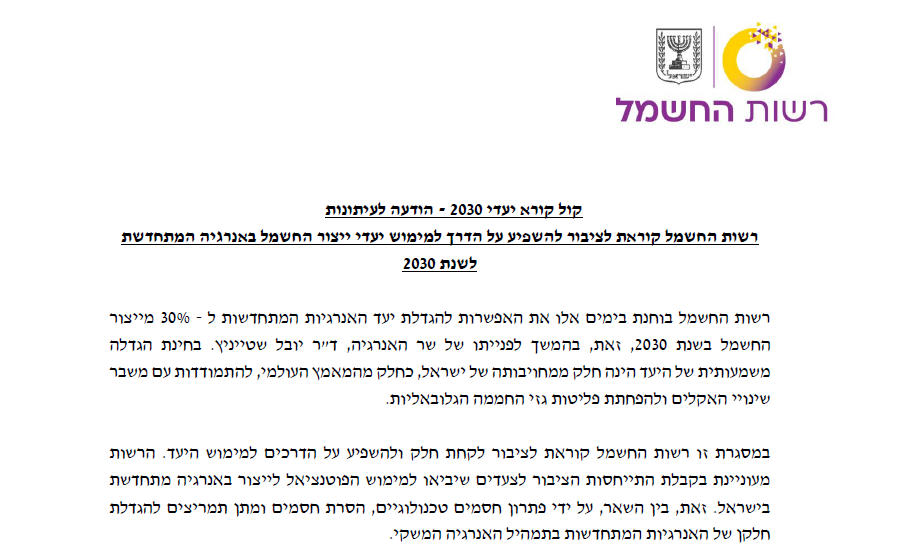 קול קורא של רשות החשמל להתייחסות הציבור בנושא יעדי ייצור חשמל באנרגיה מתחדשת לשנת 2030