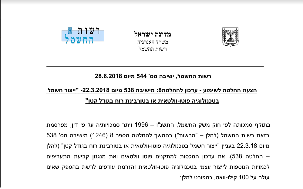 5.7.18 – הצעת החלטה לשימוע, ייצור חשמל בטכנולוגיה פוטו-וולטאית או בטורבינת רוח בגודל קטן/